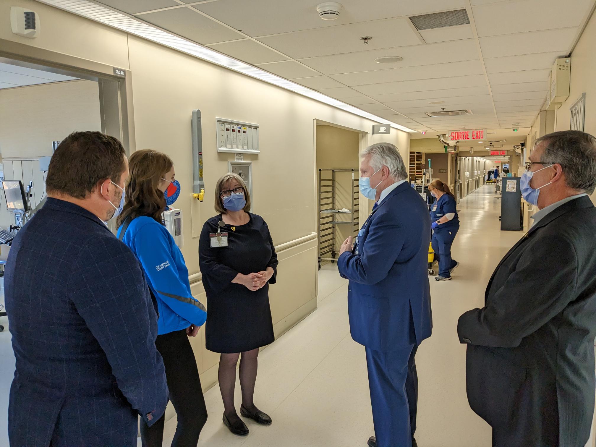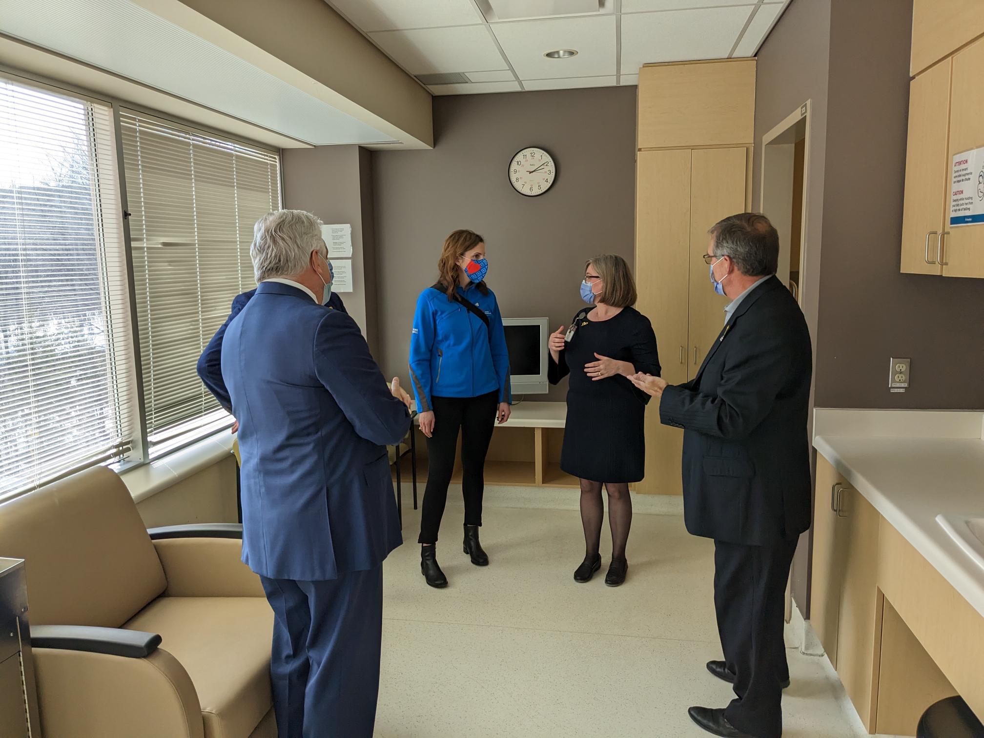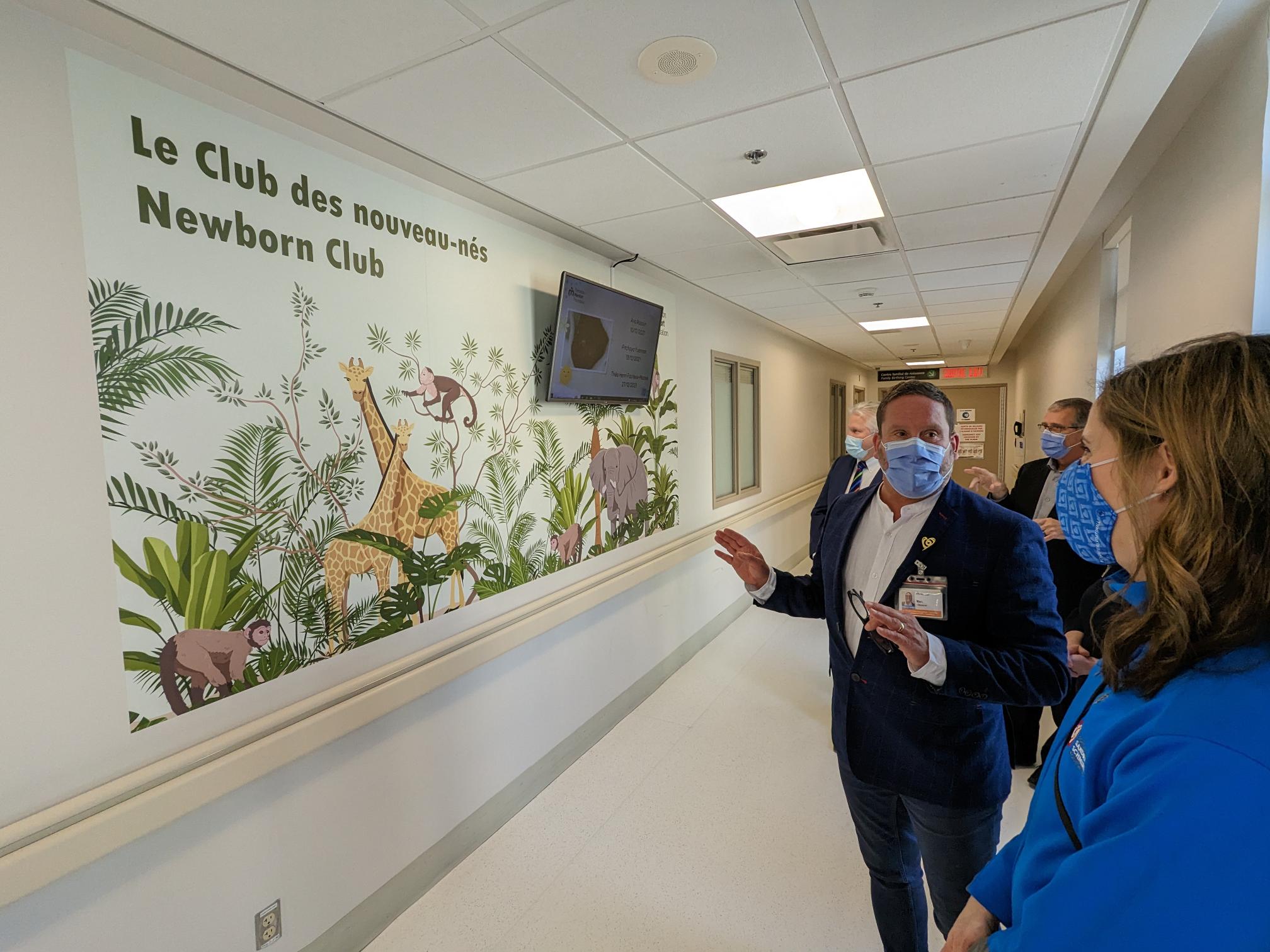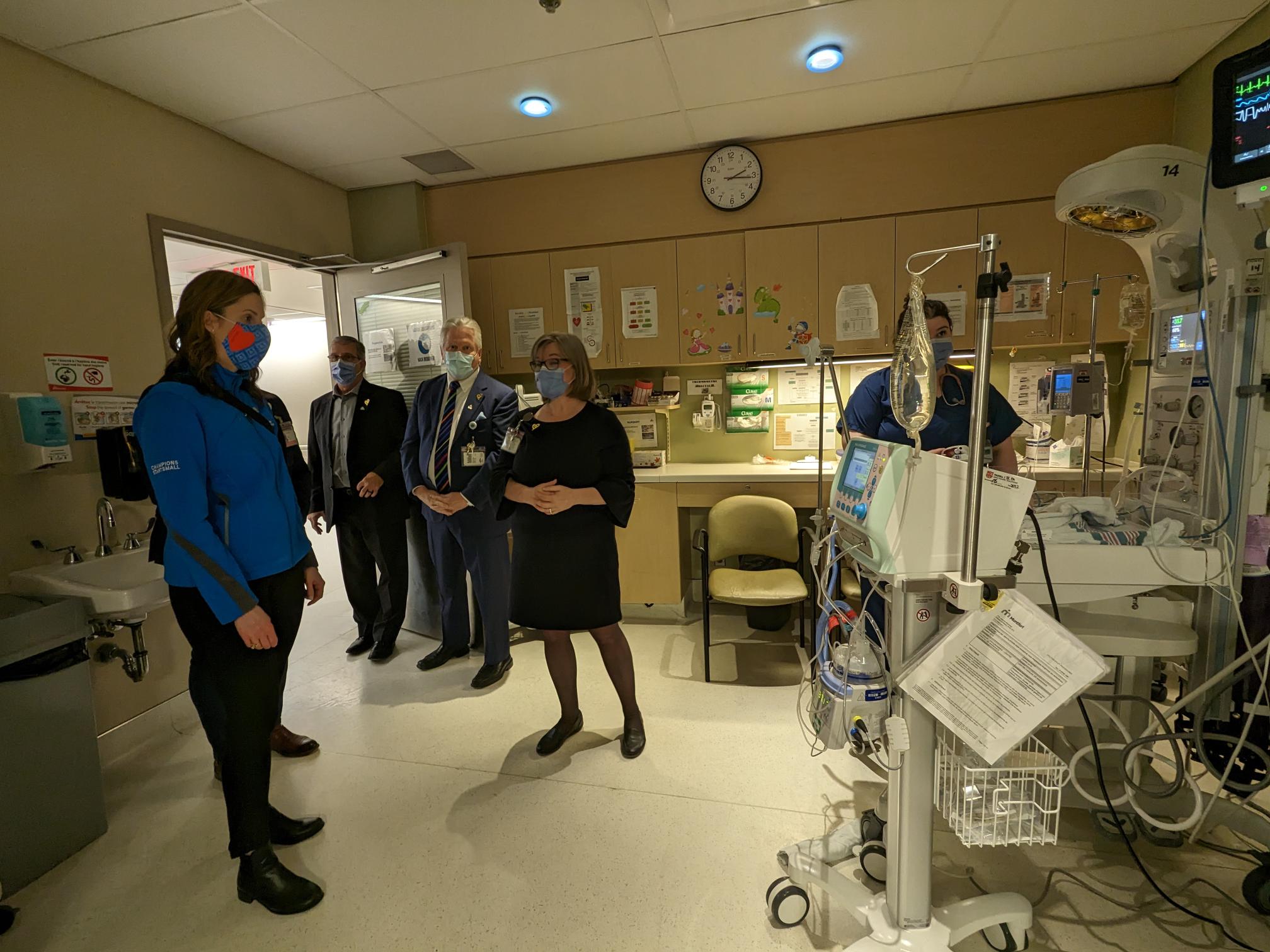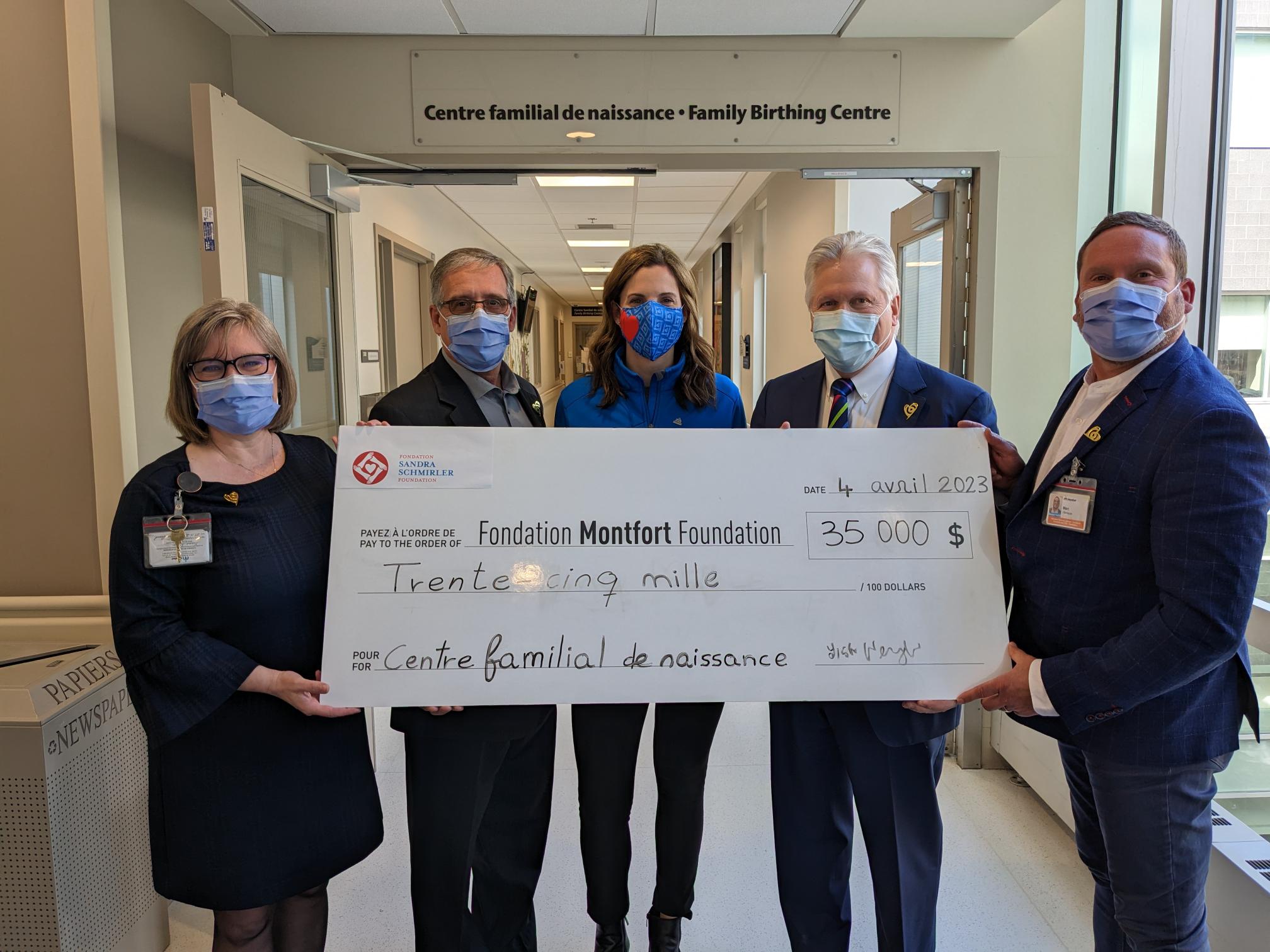 On April 4th, Lisa Weagle, Mentor of the Sandra Spirit Scholarship Program at the Sandra Schmirler Foundation, met with France Morin, Director of the Montfort Family Birthing Centre, Dr. Bernard Leduc, President & CEO of the Hôpital Montfort, Robert Rhéaume, President of the Montfort Foundation’s Board of Directors, and Marc Villeneuve, President & CEO of the Montfort Foundation, for the official presentation of the $35,000 gift and a tour of the facility. Ms.Weagle was very pleased to see the use of the heated newborn bed at the FBC nursery. All the nurses and doctors at the Family Birthing Centre are delighted to be able to work with this type of equipment, which provides exceptional comfort to newborns and reassures parents.